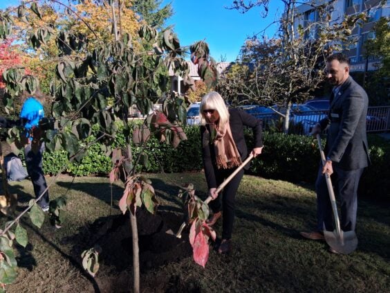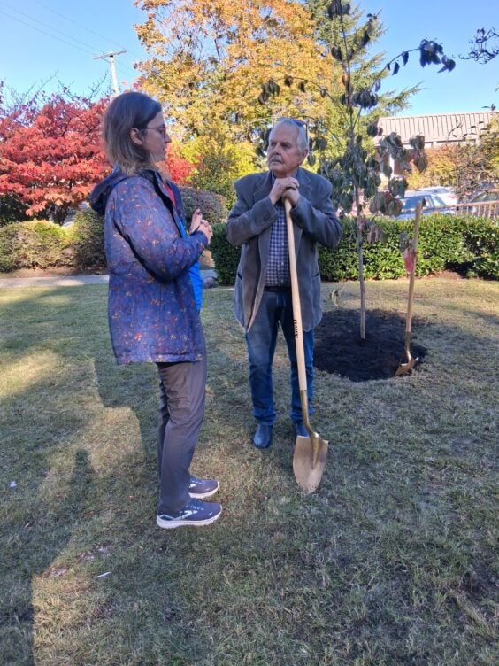 Deb Mitchell from Providence and Michael Hurley from Trees for Life use golden shovels to plant native BC trees at Youville Residence as part of the Trees for Health campaign.