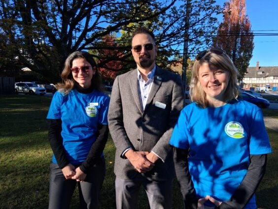 From left to right: Raluca Radu, Michael Hurley, and Theresa McElroy at Youville Residence. Providence Health Care and Trees for Life are planting trees at care sites to show thanks to people who care for others.