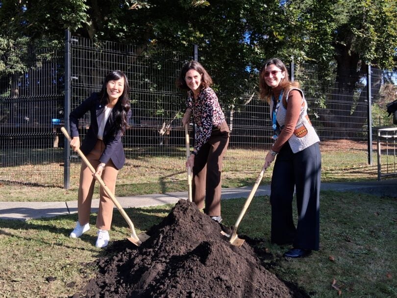 From left to right: Dr. Melissa Lem, Fiona Dalton, and Raluca Radu plant a tree at Holy Family Hospital. Melissa is president of the Canadian Association of Physicians for the Environment. Fiona is president and CEO of Providence Health Care. Raluca is a planetary health lead at PHC and an adjunct professor at UBC.