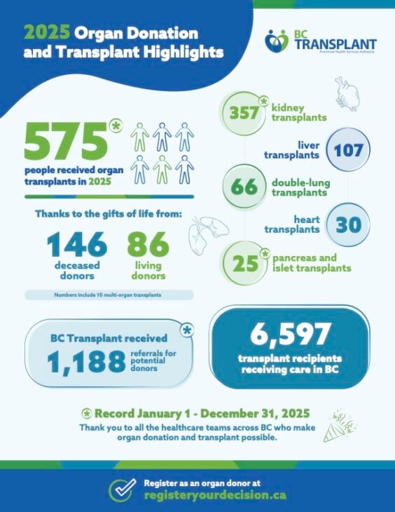 A record 575 people in British Columbia received organ transplants in 2025, thanks to the incredible generosity of 232 organ donors, including 146 deceased donors and their families and 86 living donors. This is the highest number of organ transplants ever performed in the province in a single year.